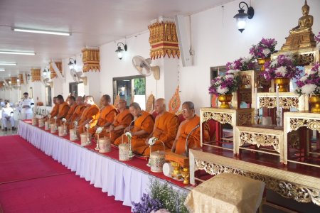 นำคณะสงฆ์สมณศักดิ์ พระภิกษุ และสามเณร ร่วมประกอบพิธีสวดพระพุทธมนต์และออกรับบิณฑบาตร