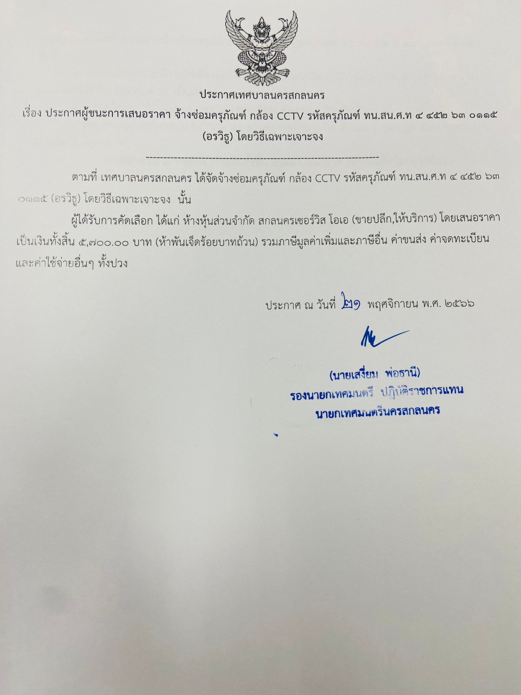 ประกาศผู้ชนะการเสนอราคา จ้างซ่อมครุภัณฑ์ กล้อง CCTV รหัสครุภัณฑ์ ทน.สน.ศ.ท ๔ ๔๕๒ ๖๓ ๐๑๑๕ (อรวิธู) โดยวิธีเฉพาะเจาะจง